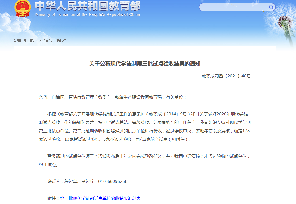 近日,教育部职业教育与成人教育司公布现代学徒制第三批试点验收结果,beat365中文官方网站作为教育部第三批现代学徒制试点院校,顺利通过验收。