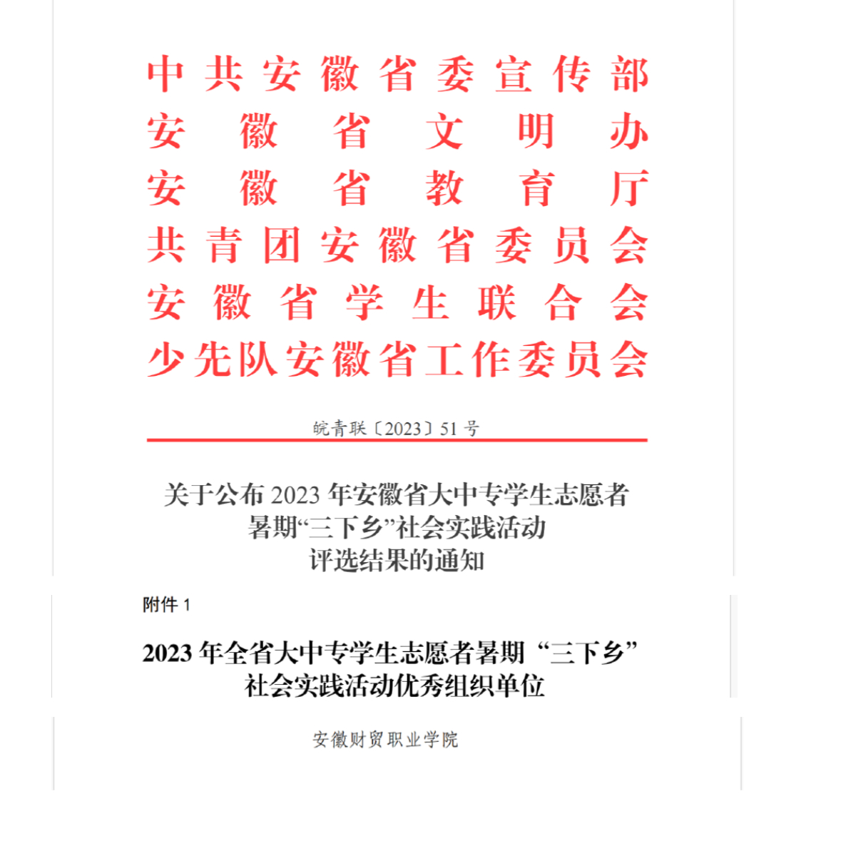 在2023年安徽省大中专学生志愿者暑期“三下乡”社会实践活动中,团委在学校党委的领导下,组建了6支校级重点实践团队、249支一般实践团队,4000余名同学参加“返家乡”,覆盖长丰县马郢村等全省50多个乡村,共6000余名师生赴省内各地农村广泛开展社会实践活动,将实践育人作为学校人才培养重要环节,引导广大青年学生坚定信念听党话、跟党走,在实践中不断提高自身综合素质,认识国情,奉献社会,在安徽大地上以青春力量助力乡村振兴,在社会实践中受教育、长才干、作贡献。此项活动受到各大官方媒体平台报道近40篇,充分展示了我校青年学子的青春风采和使命担当。
