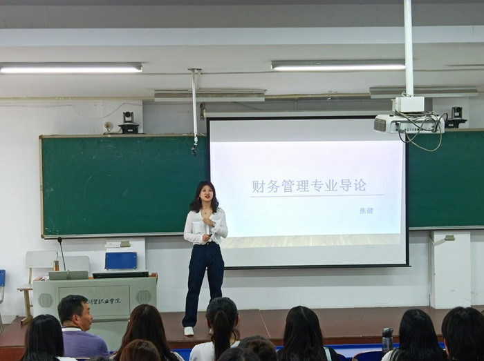 安徽财经大学会计学院财务管理系副主任、管理学博士、硕士生导师焦健,专程从安徽财经大学赶来给学生们进行入学教育授课。焦健从财务管理专业发展与就业方向、财务管理专业培养方案以及安徽财经大学财务管理专业简介三个方面来给同学们进行了清晰讲解。在入学教育课程中,焦健老师给同学们列出了财务管理专业学生可以考取的一系列证书,让学生的学习有了新的明确的目标。在介绍安徽财经大学财务管理专业的时候,她列举了安徽财经大学优秀的毕业生和较高的毕业生升硕率来激励同学们,让同学们的学习目标更明确。