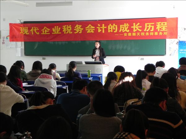 11月3日,安徽顺天税务事务所税务经理金行走进税务专业的教学课堂,给税务专业2012级和2013级学生作了题为《现代税务会计的发展历程》专题讲座。