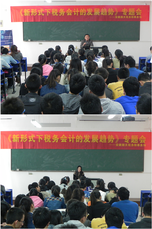 10月23日,财税金融系本学期“企业高管家家进”活动正式启动,首次活动邀请安徽顺天税务师事务所有限公司总经理汪劲松一行6人为税务专业2011级、2012级170多位同学授课。 合肥市国税稽查局俞勇科长作为特邀嘉宾,为师生们讲解了《新形势下税务会计的发展趋势》,主讲人常年从事税务案件审理工作,讲座理论联系实际,融入知识性和趣味性,引用典型案例案件,深入浅出地分析了税务会计发展的现状和趋势。顺天税务师事务所培训部经理梁修银简要介绍了事务所的税务、会计业务培训项目,并就税务、会计等专业学生顶岗实习和就业升学等相关话题与同学们进行了互动交流。