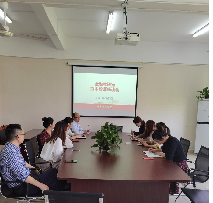 2021年5月8日,金融教研室在综合楼312办公室召开期中教学座谈会,检查各位教师的教学进度,讨论教学过程中存在的问题并提出对策,老教师给新教师分享了教学经验与教学心得。在座谈会中,教师就实训室、日常行政和教学管理分别提出了建议和意见。