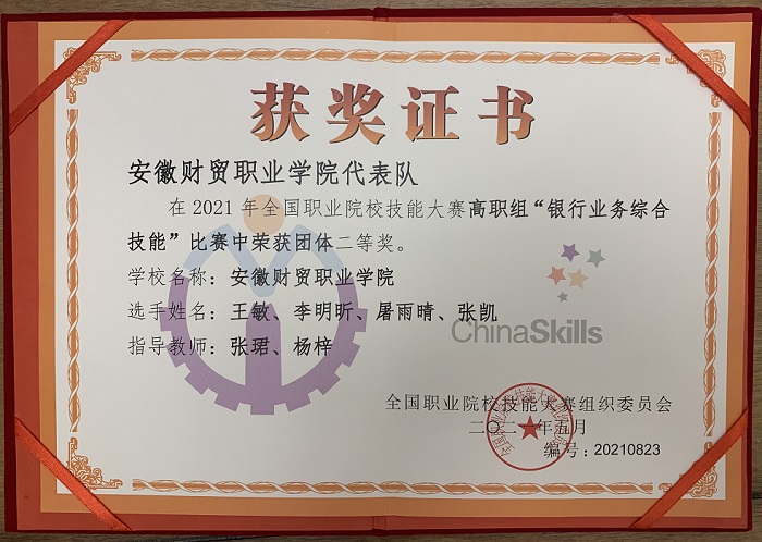 6月10日至11日,2021年全国职业院校技能大赛(高职组)“银行业务综合技能”赛项在山东外贸职业学院举办,安徽省代表队指导老师由我院教师张珺、杨梓担任,该院学生互金1901王敏、互金1903李明昕、财管1902屠雨晴、会管2001张凯参加比赛,最终斩获国赛二等奖。