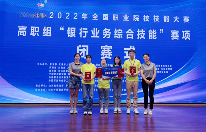 8月14日至8月15日,2022年全国职业院校技能大赛高职组“银行业务综合技能”赛项在山东外贸职业学院举行,来自全国各省、自治区、直辖市的55支队伍220名选手参赛同台竞技,经过激烈角逐,我校财会金融学院的王敏、李明昕、屠雨晴、张凯四名同学组成的代表队在杨梓、张珺老师指导下获得团体二等奖。