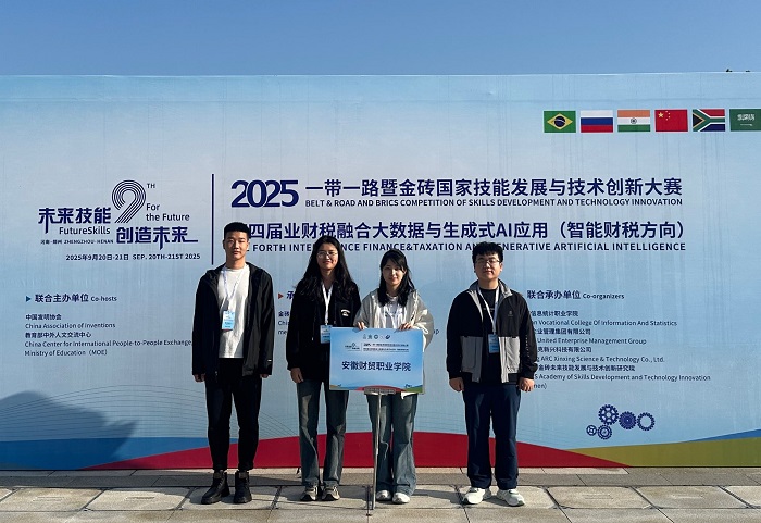 9月20至21日,2025“一带一路”暨金砖国家技能发展与技术创新大赛第四届业财税融合大数据与生成式AI应用(智能财税方向)赛项全国总决赛在河南信息统计职业学院举行。我院王子欣、张婧菁两位教师指导的孟一凡、孙虎、傅若曦、李梅四名学生组成的代表队以总分第二的成绩荣获全国一等奖。