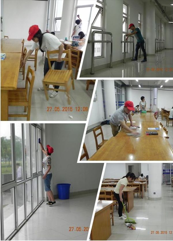图书信息中心的自修室是学院学习氛围最浓的场所,使用频率高,常常一席难求。但常年高负荷的使用也带来诸如地面污渍、墙面门窗清洁等卫生问题。20名学员利用午休时间,有的同学甚至是一下课直接就赶到图书信息中心,对一到五层的自修室从地面、桌椅到窗台门框,进行全方位的卫生清理和打扫。经过一个多小时的精心整理,五层楼的自修室焕然一新,可以为同学们提供更舒适的学习研修环境。同学们擦去额头的汗水,露出欣慰的笑容。