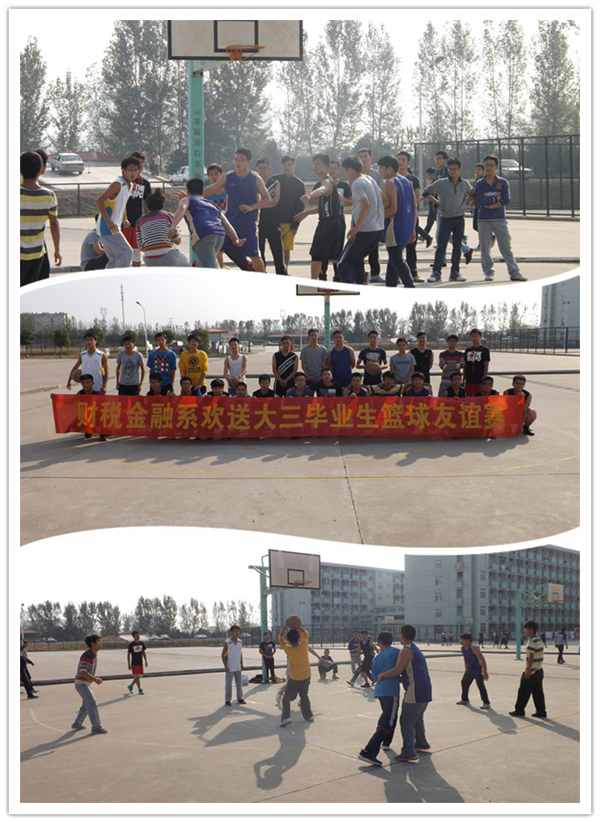 11月6日下午,财税金融系在学院篮球场举行了一场别开生面的欢送大三毕业生篮球友谊赛,毕业班同学组成的代表队与一、二年级组成的联队进行比赛。经过激战,毕业班代表队获胜。