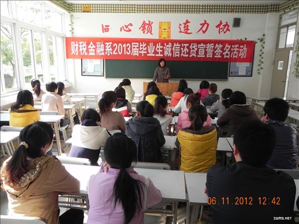 11月6日中午,财税金融系在3106教室举行了2013届毕业生“感恩助学,诚信还贷”宣誓签名活动。系党总支副书记李秀珍主持宣誓签名仪式。