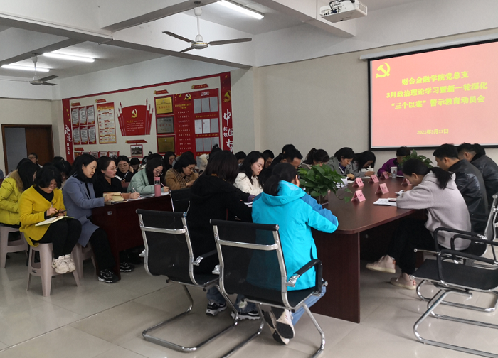 3月17日下午,财会金融学院党总支召开新一轮深化“三个以案”警示教育动员学习会,全体党员参加会议。会议由党总支副书记李健主持。