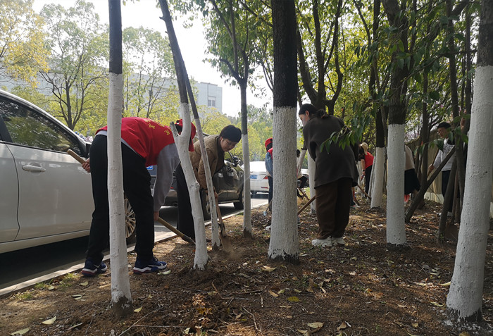 活动中,师生们干劲十足,挥锹松土、提水浇灌、修剪树枝、清理落叶,齐心聚力、相互配合,有条不紊。大家挥动的一次次铁锹、浇灌的一桶桶水、清扫的一堆堆落叶,都寄托着对支部林茁壮成长的期望,饱含着对建设美丽校园的初心,大家以实际行动践行绿色发展理念,争先植绿护绿,将春天种在支部林中、将绿色种在每个人的心中。