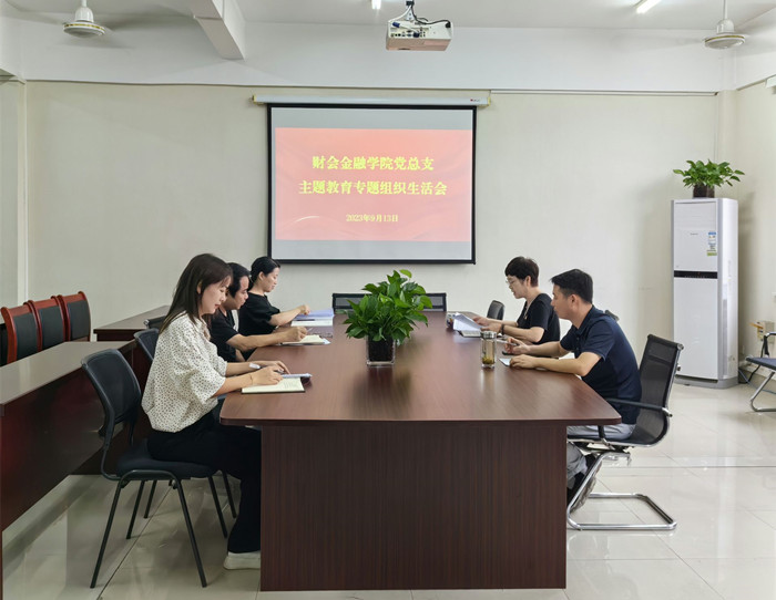 9月13日上午,财会金融学院党总支召开2023年主题教育专题组织生活会,党总支书记胡宏萱主持会议,党总支委员参加会议。