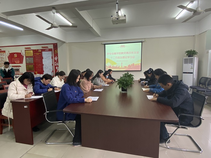 12月13日下午,财会金融学院教师第四党支部在综合楼312召开政治理论学习会。会议由支部书记葛瑶主持,支部全体党员参加。