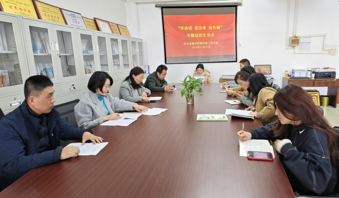 11月27日下午,财会金融学院教师第二党支部召开“学讲话 促改革 当先锋”专题组织生活会,会议由支部书记查静主持,支部全体党员参加。财会金融学院党总支委员宋鹤年列席参会。