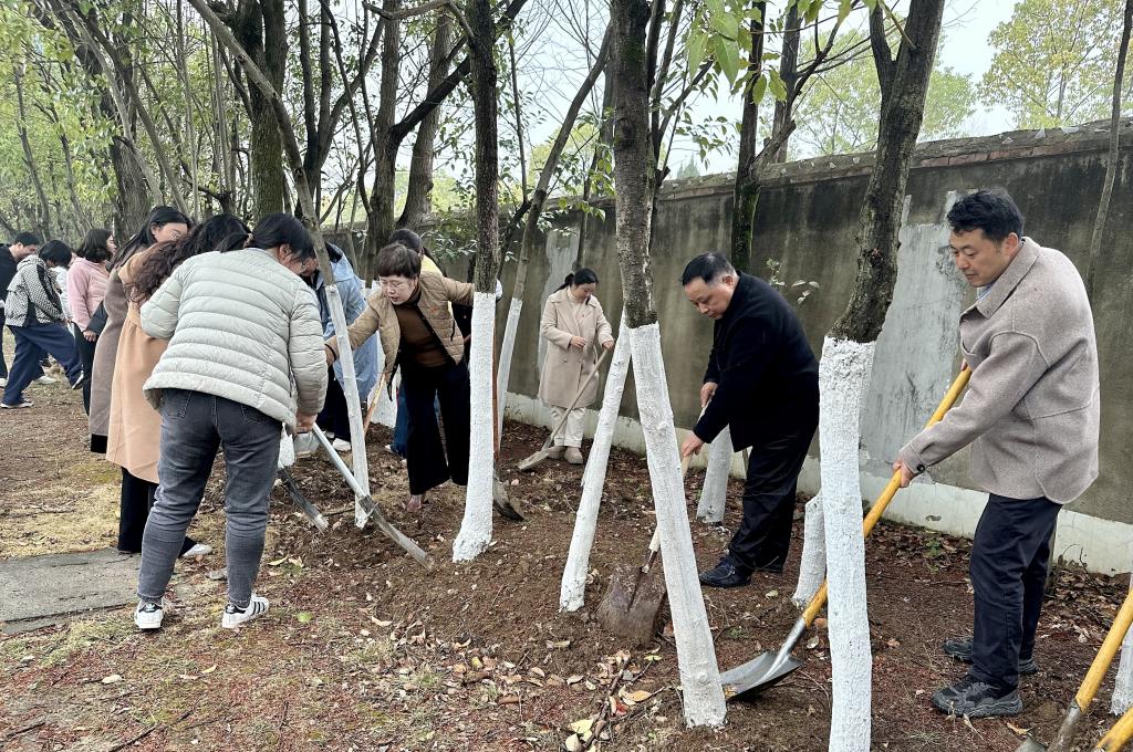 活动现场,细雨绵绵,但师生们的热情丝毫不减。大家团结协作,三五人一组,挥锹铲土、培土施肥、修枝养护,有条不紊地呵护着每一棵树。他们用汗水为校园增添新绿,现场洋溢着欢乐和谐、奋发向上的氛围。