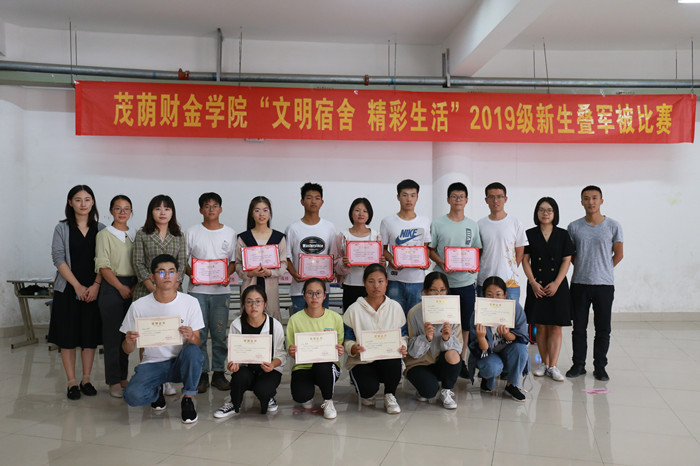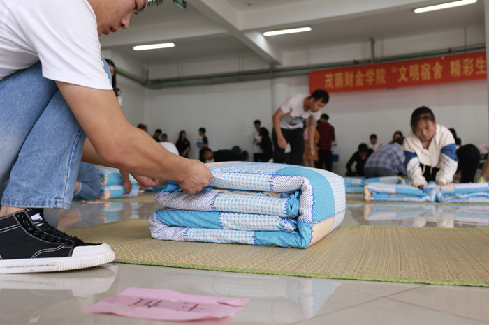 为激励广大同学营造良好的生活环境,养成良好的生活习惯。9月25日,茂荫财金学院在图书馆一楼大厅举办2019级新生叠军被大赛。茂荫财金学院团总支书记梁惠婷、学生秘书李彧佳,专职辅导员胡云芳、姜奥、郑林凤、何玉等老师应邀担任比赛评委。 大赛经过各班级班内选拔,每个新生班级推荐2位选手共30人参加了最后的现场决赛。参赛选手们准备充分,沉着冷静,随着哨声的吹响,比赛正式开始。各参赛者“平铺,横折,捏线,竖折,修边,扯角”等各个动作做的有条不紊,得心应手。比赛现场,气氛紧张,每个同学都一丝不苟,不甘落后,各展身手,他们娴熟的动作赢得现场观众的阵阵掌声,宣传部小记者们用镜头记录下每一个精彩的瞬间。时间一秒一秒的流逝,8分钟很快就过去了,紧张的等待着各位评委老师的评审。放眼望去,大厅内的被子方方正正、整整齐齐、有棱有角,是名副其实的“豆腐块”。