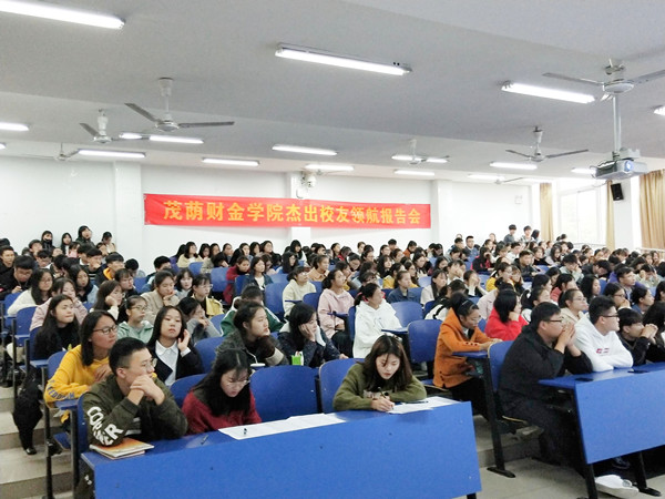 11月7日下午,茂荫财金学院举办杰出校友领航报告会,邀请优秀毕业生回母校与在校学生分享学习成长经历,领航学生职业发展。2018级200余名学生聆听报告会,党总支副书记胡宏萱主持报告会。