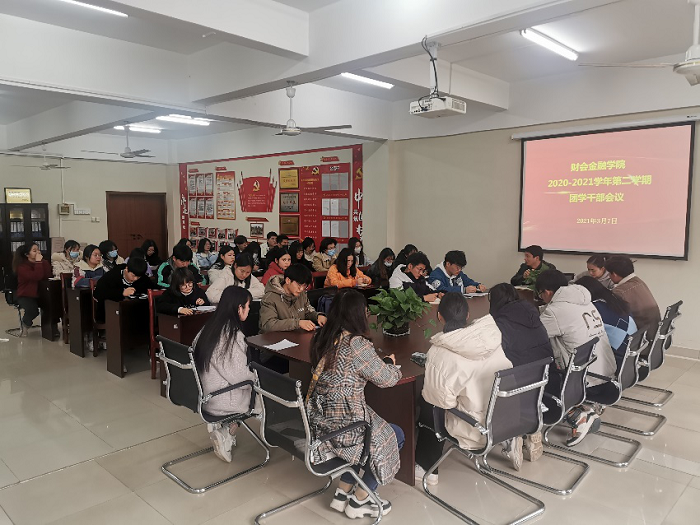 3月7日下午,财会金融学院在综合楼312办公室召开了新学期首次团学干部会议。党支部副书记李健、团支部书记沈丽萍以及全体团学干部参加会议,会议由沈丽萍主持。
