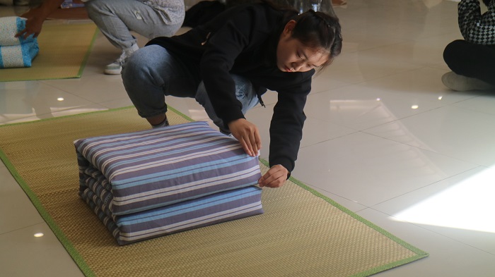 叠军被大赛是我院安全卫生文明月的传统活动之一,为充分做好赛前准备,财会金融学院于9月组织开展了针对二百三十余位新生寝室长的叠军被培训活动,10月初顺利开展叠军被大赛初赛活动。经过激烈角逐,10月13日中午,财会金融学院在图书馆一楼举行叠军被大赛决赛,在比赛现场,参赛选手们有条不紊做好每一个动作,蹲下、铺平、压实、翻折、抠角、捏线一气呵成。大家认真对待叠被子的每一个细节,一捏一折,动作利落娴熟,被整理过的被子棱角分明,结构紧凑。