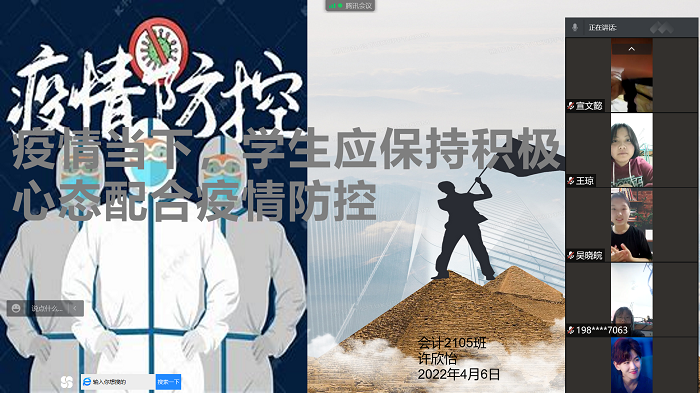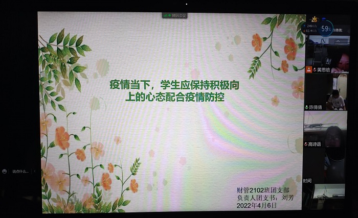 4月6日晚,各团支部通过腾讯会议、QQ群等手段开展专题线上口训。各班级团支书首先带领同学们学习学校疫情防控制度、疫情防控措施以及如何正确应对疫情期间心理健康问题等,并组织观看抗疫视频,学习内容展现了中国特色社会主义制度在防疫中的巨大优势,彰显了中华民族在疫情面前万众一心、众志成城、守望相助的态度与决心。随后,同学们在线上平台进行激烈的讨论和交流,以口训的方式分享疫情防控认识以及青年学生身体力行的感悟,财管2101王乐萱同学表示:疫情严控期间作为学生应做好自我管理,积极配合学校的防控措施,引导班级同学互相监督、相互提醒,共创安全校园。会计2102王依林同学表示:疫情期间,青年学生要做到不造谣不传谣,齐心协力防战疫情,遵守学校规章制度,这是我们的责任,更是我们的义务。