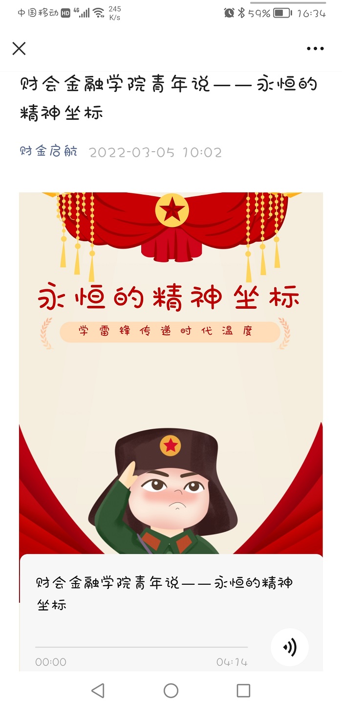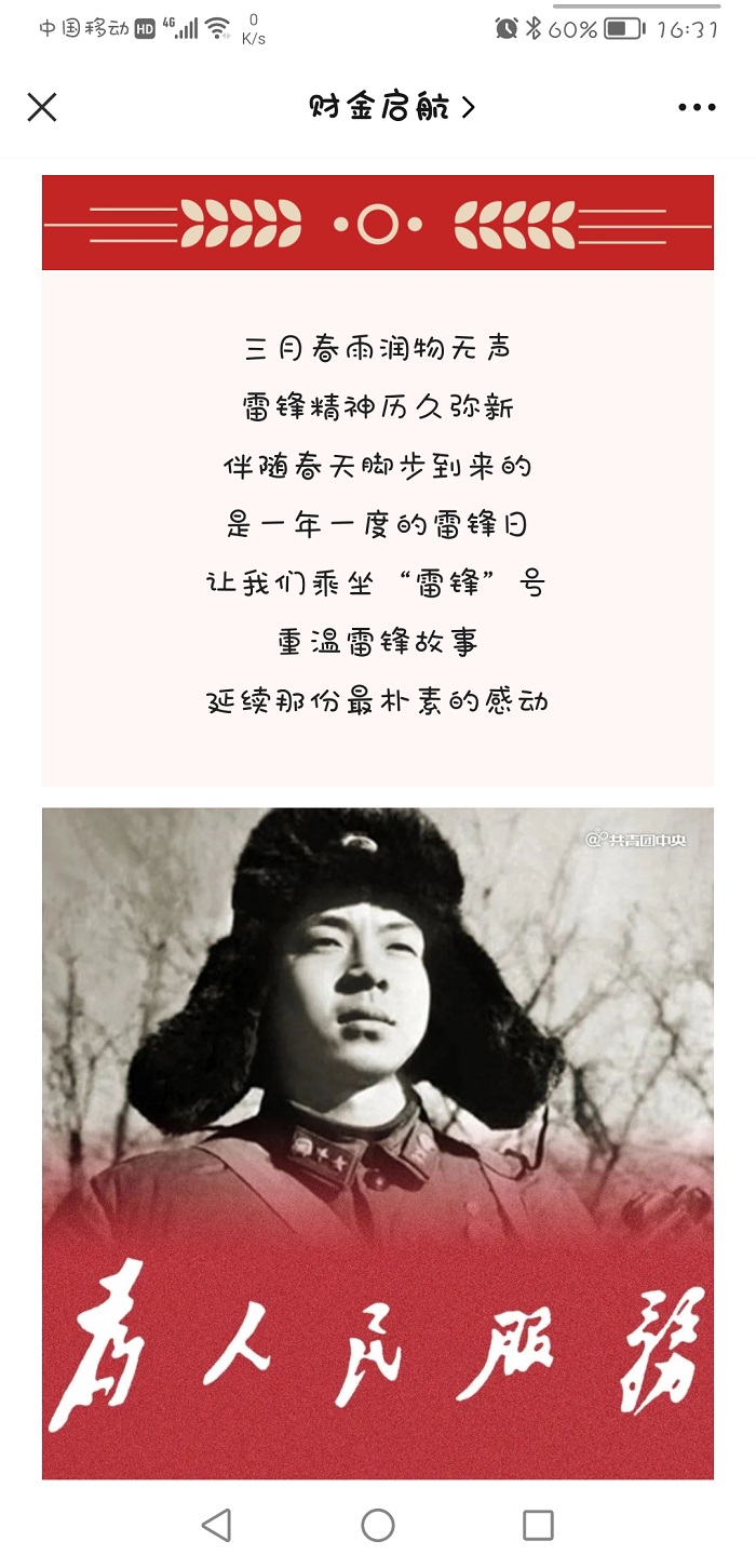 三月是春光明媚、生机勃勃的季节,更是讲文明、学雷锋的季节。为大力弘扬“奉献、友爱、互助、进步”的志愿精神,动员广大团员青年积极践行社会主义核心价值观,财会金融学院组织开展“永不褪色的精神坐标”学雷锋主题团日活动,以线上线下相结合方式弘扬雷锋精神,掀起学雷锋热潮。