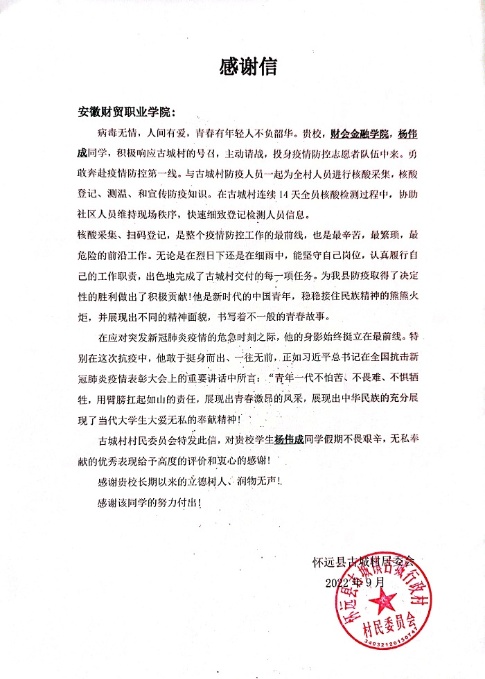 9月5日,财会金融学院收到怀远县古城村居委会感谢信,感谢金管2102班杨伟成同学在新冠疫情防控中所做出的积极贡献。