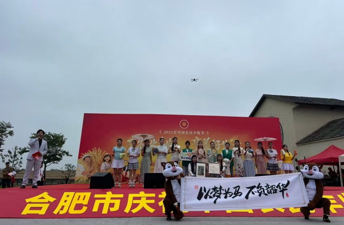 9月23日,中国农民丰收节当天,团队走进岗集镇青峰岭村主会场,同学们创新地将乡村特色IP元素搬上舞台,打造了一场融合视听旁白、视觉走秀与舞台表演的时尚秀场。大学生化身乡村文化代言人,将马郢村“蔬果农场”“草木扎染”“古法陶艺”“油纸伞”“赛马运动”等特色文化元素融入舞台视觉与服饰设计,通过动静结合的形式,生动呈现当地文旅资源、非遗技艺与农特产品。展演不仅传递丰收喜悦,更以青春创意挖掘乡村文化内涵。