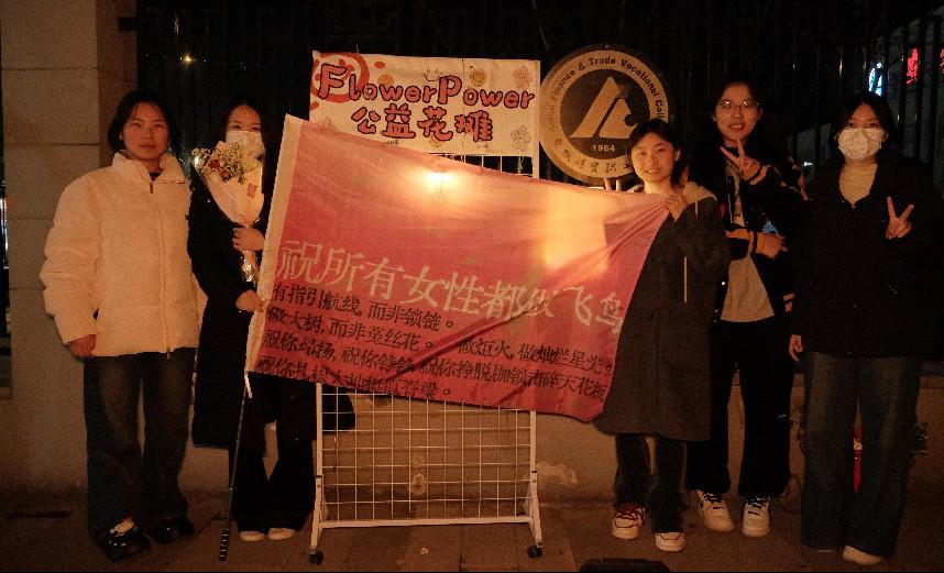 活动现场,向日葵与满天星装点的花摊吸引众多师生驻足。花束定价13.14元和19.9元,寓意“一生守护”与“长久关怀”。每束花附赠定制贴纸,印有“拒绝标签化”“拒绝定义”等标语,鼓励参与者清理街头非法广告,让公益融入日常。购买者还可以写上祝福悬挂在“鲜花能量墙”上,传递对女性的支持。短短数小时,百余条手写寄语汇聚成“女性力量宣言墙”,成为活动现场最温暖的风景。