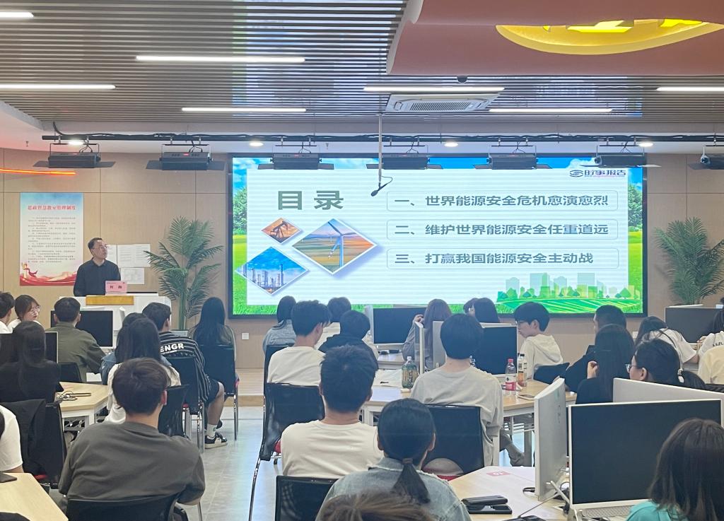 党委副书记、副校长何翔以《正确认识全球能源安全形势》为主题,阐述了打赢我国能源安全主动战的措施,鼓励青年学生努力学习、健康生活、低碳出行,共同维护国家能源安全。