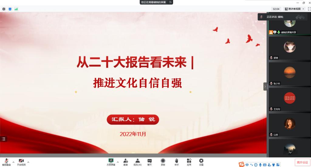 11月2日,马克思主义学院党支部宣传委员储锐通过线上方式主讲了主题党课,旨在进一步学习宣传贯彻党的二十大精神。马院全体党员教师参加。