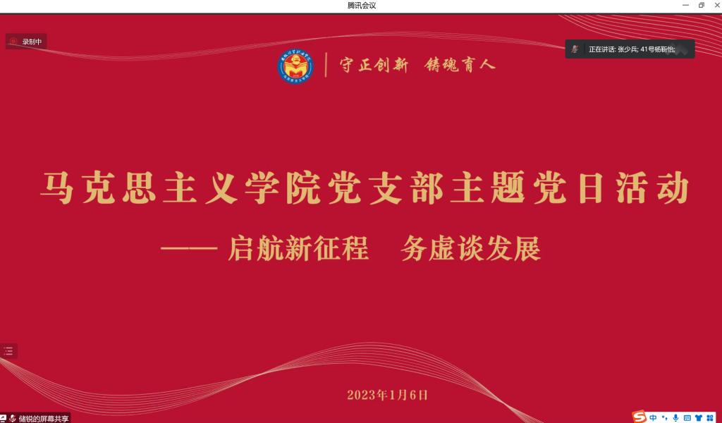 为集思广益谋划好马克思主义学院2023年各项工作,1月6日晚上,马克思主义学院党支部召开了“启航新征程 务虚谈发展”线上主题党日活动,会议由支部书记张少兵主持,全体党员教师参会。