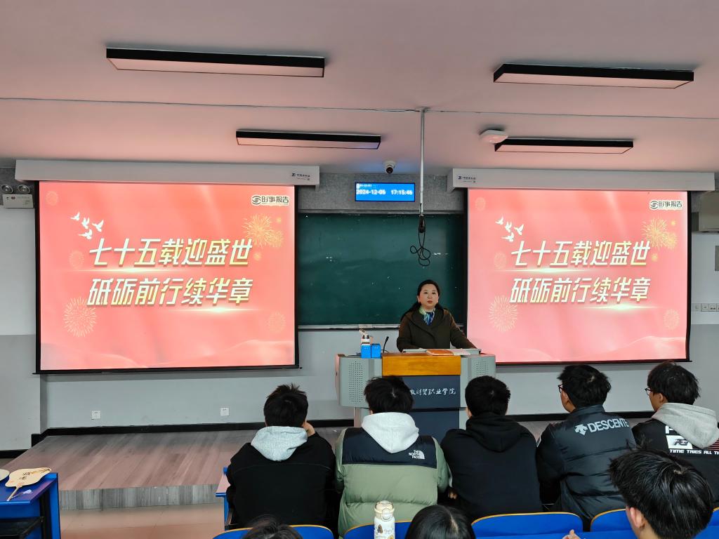 12月6日晚,公共教学部党总支副书记宋凌云在6101阶梯教室作了题为《七十五载迎盛世  砥砺前行续华章》专题报告,公共教学部100余名青年学生参加报告会。