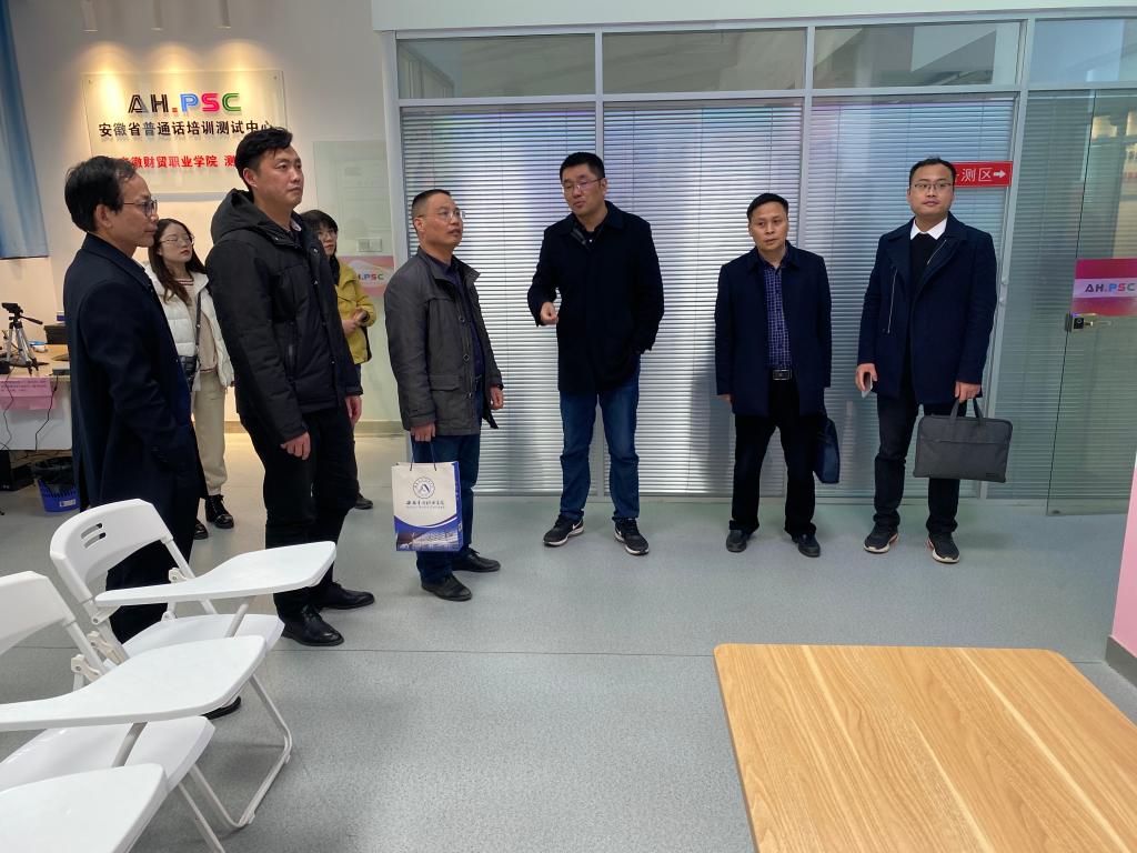 3月17日下午,安徽审计职业学院教务处副处长王家明、基础部副主任马新民、教务处教务员万启生一行来学院参观考察普通话测试站建设情况。公共教学部主任王学峰、副主任陈伟,教务处副处长廖步岩、公共教学部普通话测试站副站长杨志祥等陪同参观考察。