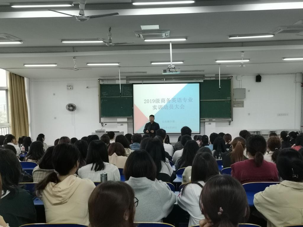4月26日上午,公共教学部2019级商务英语专业实训动员大会在6302教室举行。校企合作单位安徽轩昂教育科技集团董事长王磊、行政总监陈蕾、美工总监沈虹、公共教学部副主任陈伟出席了此次大会。