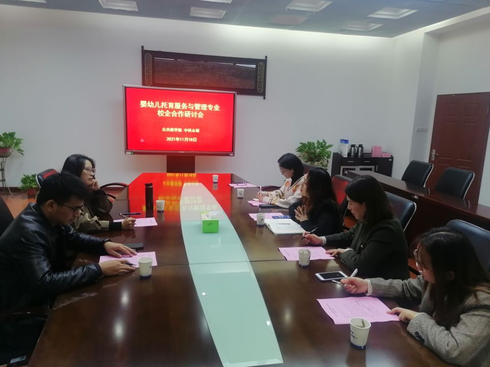 为积极促进婴幼儿托育服务与管理专业校企合作的深入开展,11月18日下午,公共教学部在行政楼二楼第三会议室召开校企合作研讨会,会议由公共教学部副主任陈伟主持,安徽中科众硕教育科技有限公司董事长胡彩红、总经理朱小斌,公共教学部办公室主任杨志祥、人文教研室主任赵倩、幼管专业负责人王潇和幼管专业课教师胡利繁出席了会议。