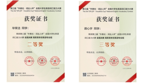 5月27日,由公共教学部组织参加的第三届“外教社·词达人杯”全国大学生英语词汇能力大赛高职高专组全国决赛顺利收官,我校取得了全国二等奖和三等奖的历史最好成绩。