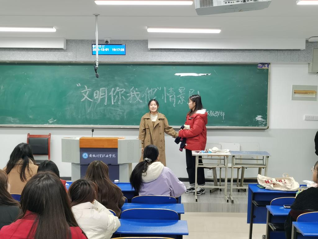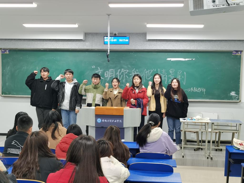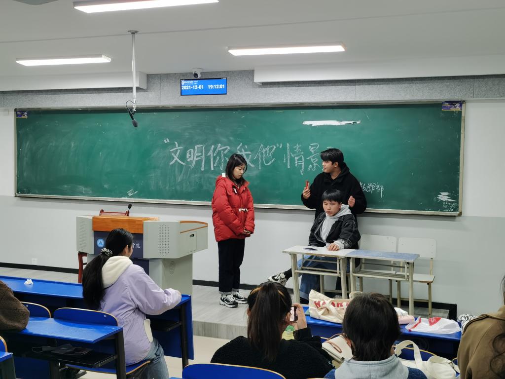 为促进大学生养成良好的行为习惯,树立文明和谐健康的校园风气,公共教学部于12月1日晚举办以“文明你我他”为主题的校园文明情景剧表演。由七名同学参加本次情景剧表演,全体团学干部和部分同学作为观众观看本次演出。