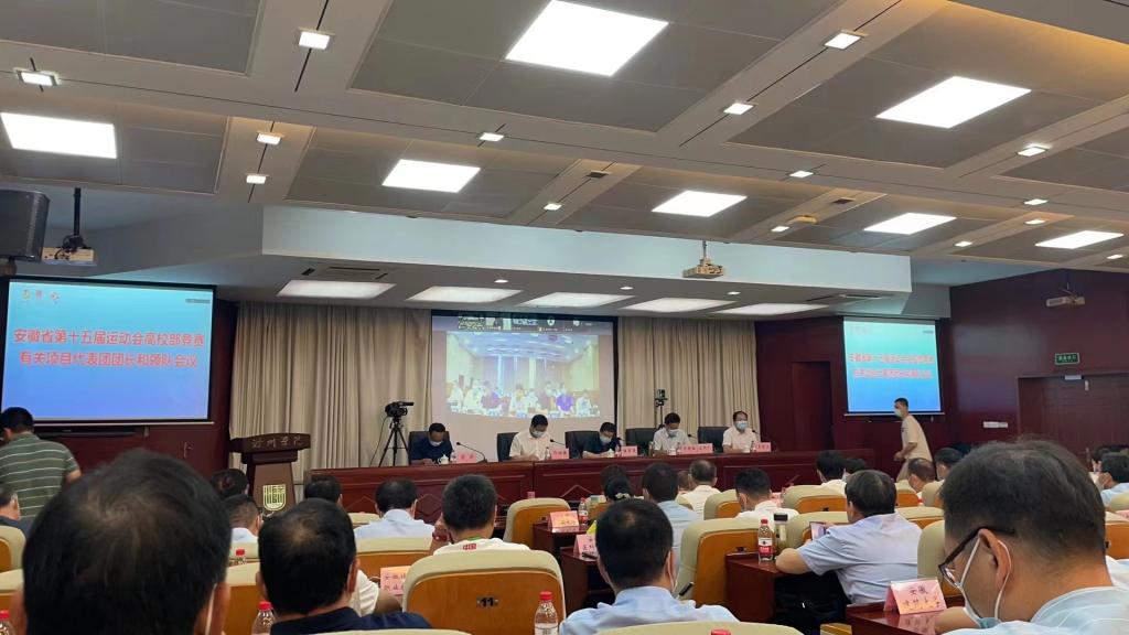 7月17日下午,安徽省第十五届运动会高校部竞赛有关项目代表团团长和领队会议在滁州召开,学校党委副书记、校长刘银国参加会议。