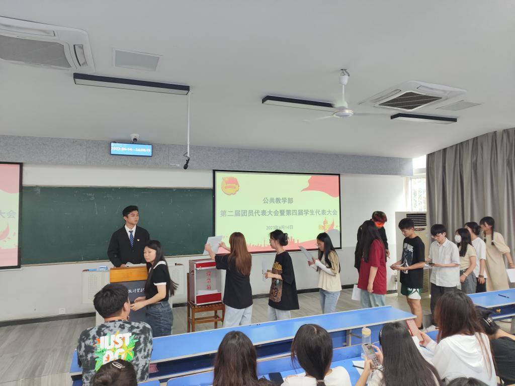 会议在庄严的国歌声中拉开序幕。大会首先宣读了公共教学部党总支《关于同意召开公共教学部第二次团员代表大会暨第四次学生代表大会的批复》并听取和审议了公共教学部第一届团总支、第三届学生会工作报告。会上,何步新代表公共教学部党总支对大会的召开表示热烈祝贺,对上一届团总支、学生会工作给予了肯定,对即将选举产生的新一届团学组织成员提出了要求与期望。大会第二阶段,本着民主、公平、公正、公开的原则,通过差额选举产生了新一届团学组织成员。