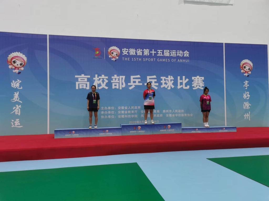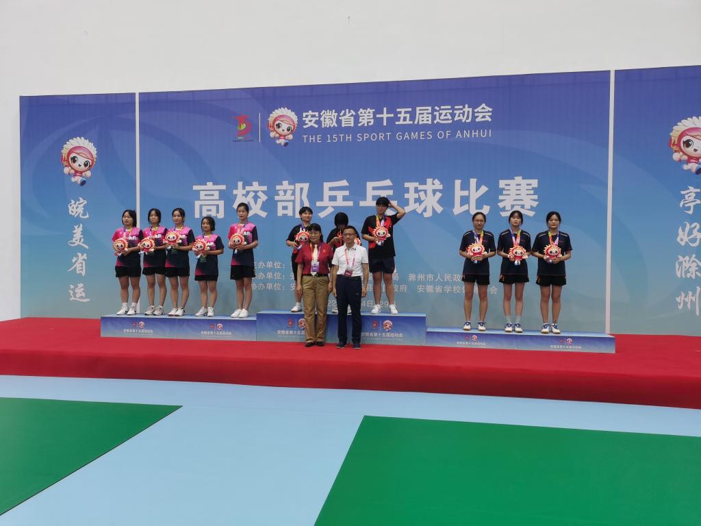 8月29日,安徽省第十五届运动会高校部乒乓球比赛在安徽科技学院圆满落幕,我校共有6名运动员参加了本届省运会乙组比赛。同学们不畏强手,顽强拼搏,经过激烈角逐,取得女子团体第三名,财税2101潘姝霖获得女单第二名、传播2101童佳乐和会计2116陈媛媛获得女双第五名的好成绩,潘姝霖和造价2002李晓弟获个人体育道德风尚奖,我校运动队荣获体育道德风尚奖。