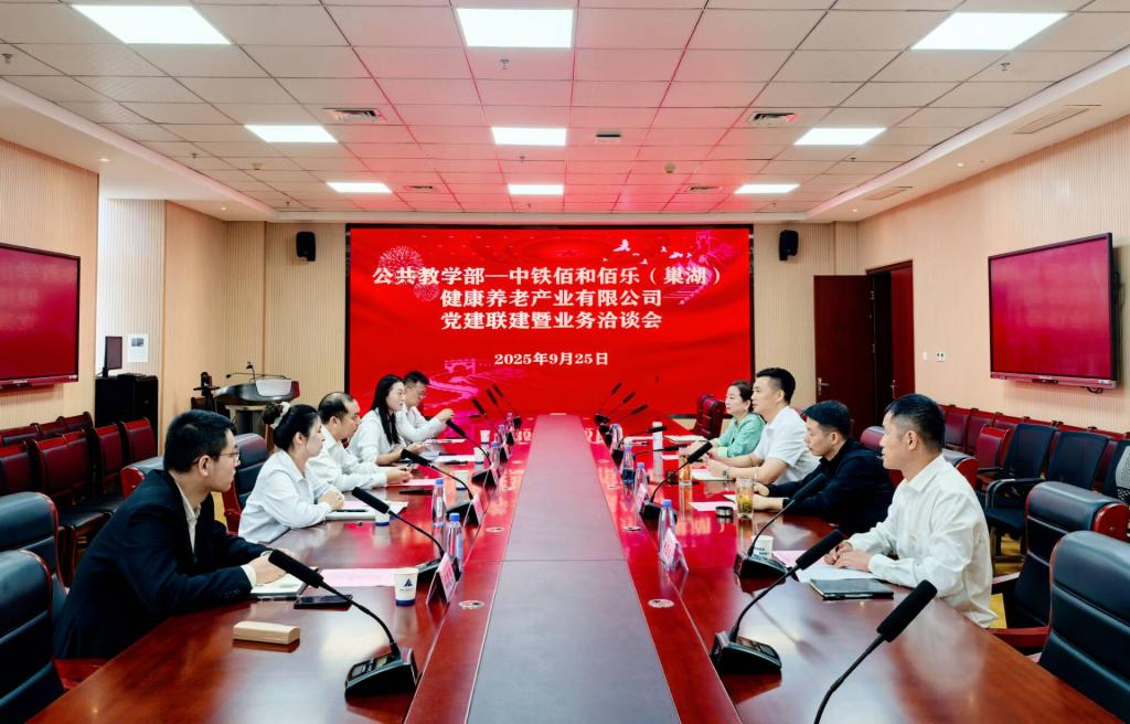 2025年9月25日上午,公共教学部与中铁佰和佰乐(巢湖)健康养老产业公司在学院行政楼308会议室举行“党建引领聚合力,校企融合促发展”党建联建暨业务洽谈会。双方围绕党建共建、人才培养、校企合作等方面展开深入交流。