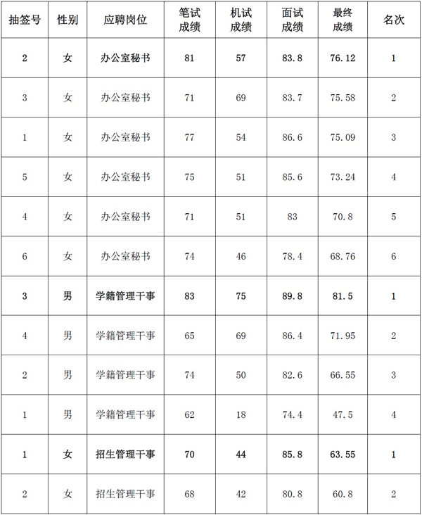 现将考生三项考核及最终合成成绩予以公示,如无异议,最终三个岗位合成成绩第1名的考生将进入体检考察、岗前培训和录用环节,请保持手机畅通,因故出现人选缺额的,将依据最终合成成绩排名,依次等额递补。感谢各位考生对学院工作的关注和支持。