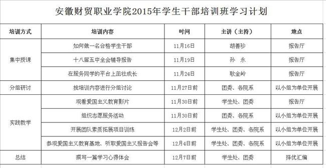 (1)根据团学工作特点,通过技能培训、社会实践、影片观摩等方式进行实践锻炼,增强学生干部理论联系实际的工作能力,提高学生干部的工作能力和服务广大同学的水平。