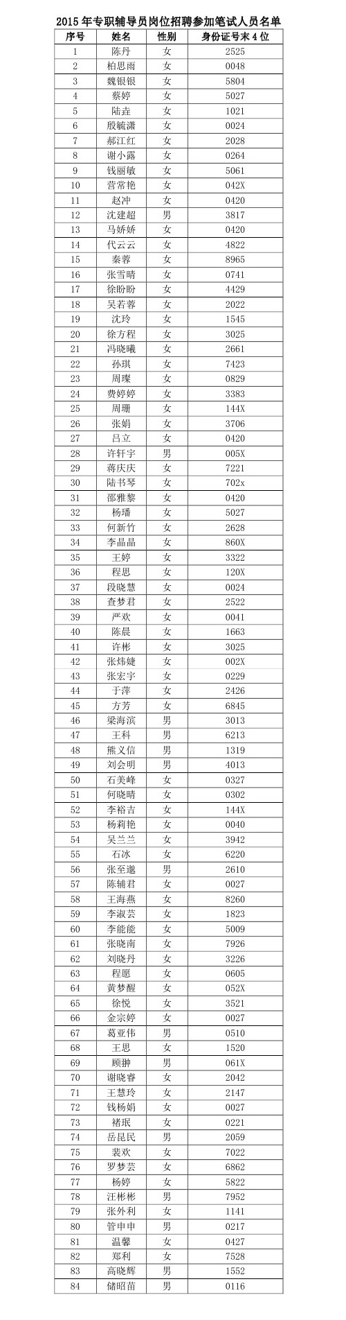 附件:2015年专职辅导员岗位招聘参加笔试人员名单
