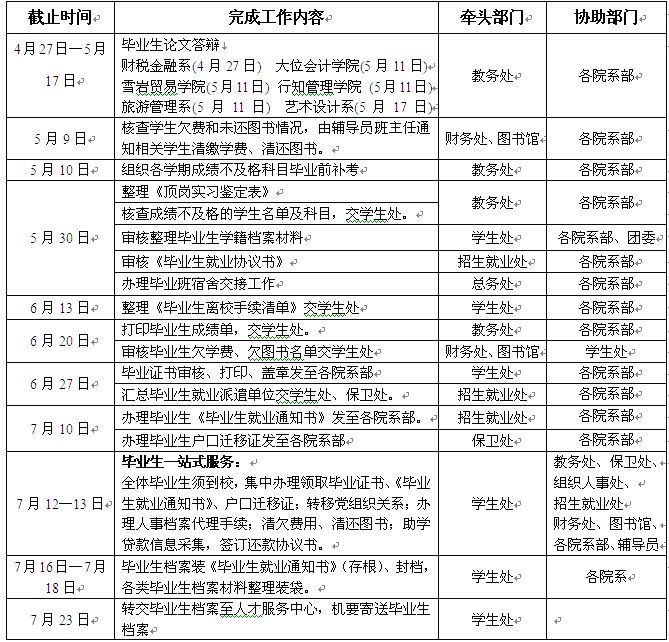 1.符合毕业条件的学生,由本人到所在院系部,领取毕业证书、《毕业生就业通知书》、户口迁移证;其他欠学费的学生,需先到财务处缴清费用,凭学费缴清证明到学生处领取。委托人事档案关系代理的学生,其户口迁移证、个人档案由学院负责转递。