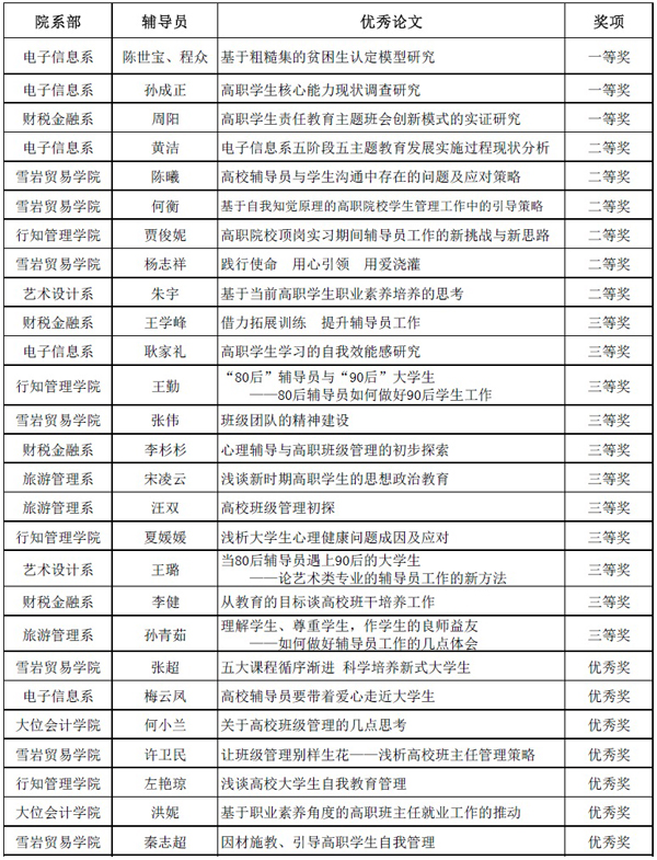 希望获奖的辅导员再接再厉,勤于研究,取得新的成果。各院系部要进一步深化财贸素养教育,积极探索学生管理工作的有效途径,全面提升大学生思想政治教育工作水平。