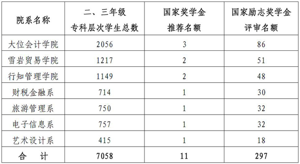省教育厅分配我院国家奖学金名额8名、国家励志奖学金名额297名。根据各院系二、三年级专科层次学生人数,分配推荐名额如下: