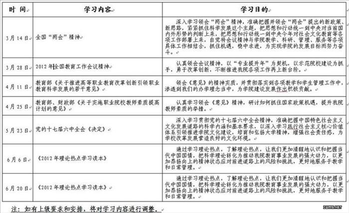 2012年是党的十八大胜利召开的重要一年,也是我院“专业提升年”和示范院校建设的关键一年。根据省委教育工委、省社机关党委的有关文件精神,按照院党委的总体部署,下面就我院2011-2012学年度第二学期教职工政治理论学习计划作如下安排: