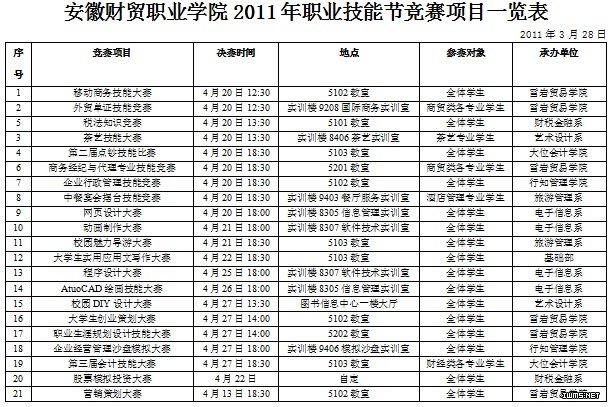 根据近日省教育厅下发《关于举办2011年安徽省职业院校技能大赛的通知》(皖教职成〔2011〕4号)文件精神,为将学院职业技能节竞赛项目与省级技能大赛接轨,经研究,现将有关事项通知如下: