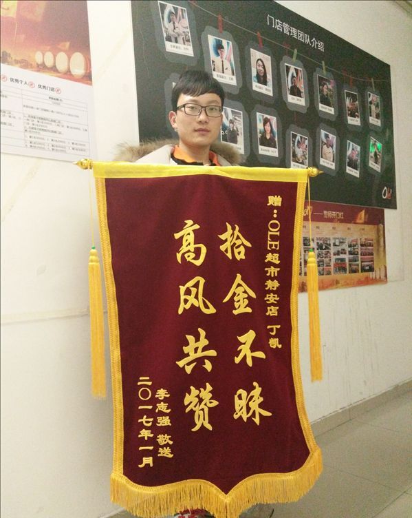 2016年7月开始,丁凯和连锁1402班的部分同学在教师工作站的引荐下,前往上海华润万家超市有限公司收货部实习。入职以来工作主动,态度积极。2016年12月9日,丁凯在下班路上捡到钱包一个(内有现金1500元、银行卡、医保卡、票据等),捡到后立即拨打110将钱包交给警方。丁凯同学拾金不昧的事迹被上海华润万家超市有限公司OLE上海静安嘉里店予以通报表扬,并获得失主所赠锦旗一面。