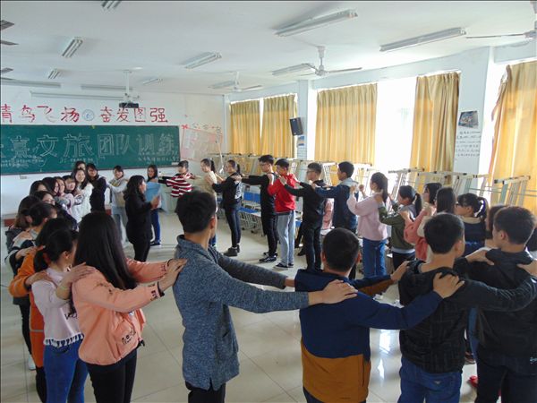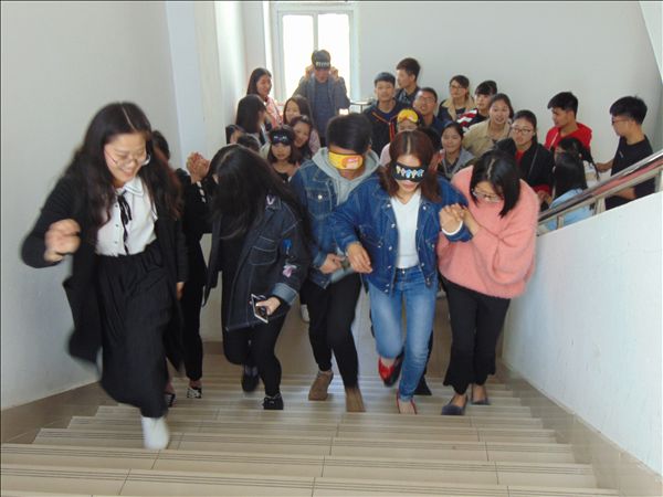 在朱熹文旅学院团总支副书记张妞的组织下,参训同学分成3个小队,每一小队“民主”选举出队长,确定队名“快乐家族队”、“天天向上队”、“团结至上队”。三个队伍合作完成了“运筹帷幄,共建高楼”、“传话筒”、“盲行”、“万里长城”等四个有趣的游戏。令很多同学感受最深刻的是“盲行”活动,一个用眼罩蒙着眼睛的“盲人”,在另外一根“拐杖”的搀扶下,相互依偎前行,“盲人”摸索着前进,而“拐杖”则无微不至地照顾 “盲人”。他们上下楼梯,克服一个又一个障碍,最终圆满完成任务,同学们深刻地体会到了团队的责任和人与人之间的相互信任。